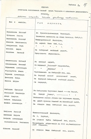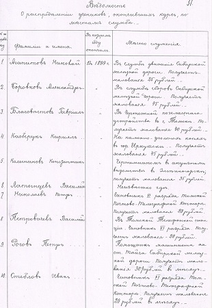 Из 11 выпускников 1911 г. двое направлены в собственное дело, двое на частную службу, двое в Красноярское депо, двое продолжать учебу, один в Переселенуправление, один на железную дорогу.
