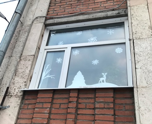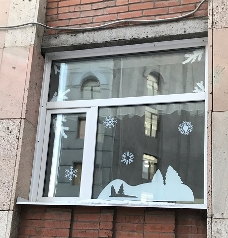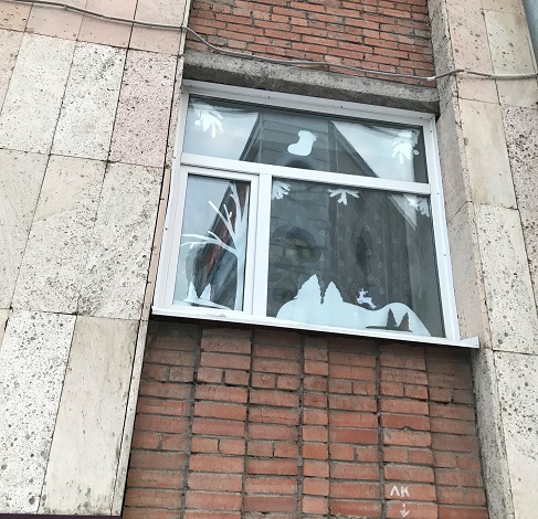 Поэтому окна ТомИнТеха украшают не только традиционные снежинки, но и еловые ветки, олени, снеговики, зимние пейзажи и другие символы Нового года.