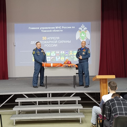 Открытый урок проводили Рахимов Р. Х. — старший государственный инспектор по маломерным судам ГУ МЧС России по Томской области, и Курынов Ю. А. — старший инженер отдела организации пожаротушения ГУ МЧС России по Томской области.