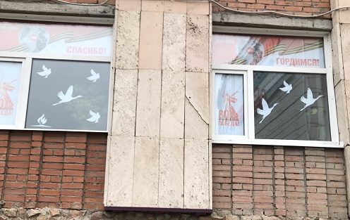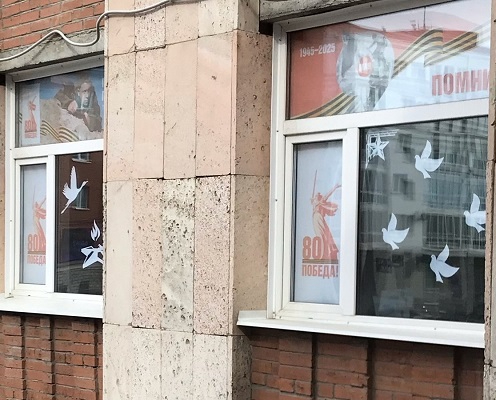 Окна наших корпусов украшены тематическими рисунками и символами Победы: георгиевскими лентами, памятниками, журавлями. Эти символы Победы на окнах стали знаком уважения и благодарности нашему народу-победителю в Великой Отечественной войне.