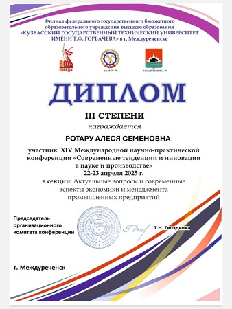Доклад занял 3 место в секции «Актуальные вопросы и современные аспекты экономики и менеджмента промышленных предприятий».