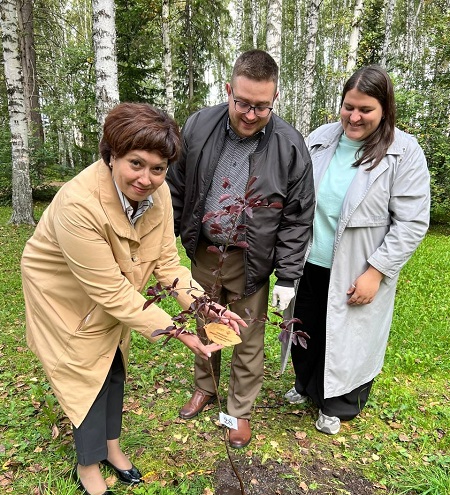 Директор ТомИнТеха Д.А. Котырло, заместитель директора Е.А. Уланова и и.о. начальника воспитательного отдела Д.Н. Бирюкова посадили необычную краснолистную черемуху.
